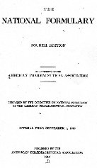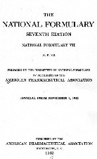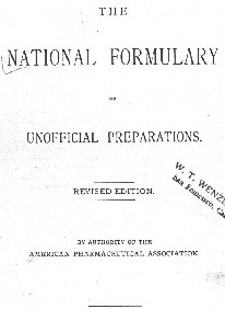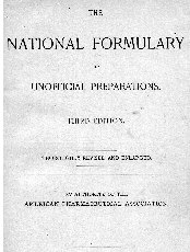 The N.F. (The National Formulary) ABOUT THE NATIONAL FORMULARY: The first edition of the "National Formulary" (originally named "The National Formulary of Unofficial Preparations") came out in 1888. It had been put together by a group of pharmacists, members of "The American Pharmaceutical Association," for the same exact reasons that had earlier led to the creation of the U.S. Pharmacopoeia, to standardize medical formulas. However, instead of working in competition with the U.S.P., the National Formulary (NF) served as a complement to it. While the U.S.P. served to set standards for base drugs, the NF served to standardize the higher-level or compound drugs which made use of more than just one base drug. The Following is taken directly from the original 1888 issue of the N. F. "It is well known that the remedies for which the Pharmacopoeia prescribes definite standards, constitute only a limited portion of the resources of the medical profession in the treatment of the sick. Without referring to the more ephemeral preparations, or to such as are of a proprietary character, or are used by the public for self-medication, there is a large number of others, which are more or less frequently prescribed by physicians, or demanded by the public, but which are not recognized by the Pharmacopoeia, either because they were not deemed by the revisers to be of sufficient importance to be included in the official work, or because they originated subsequently to the appearance of that work, or for other reasons. Owing to the absence of an authoritative standard, many of these unofficial preparations have been, and are being made, after different formulae, and in varying strength, so that the pharmacists, particularly in the larger cities, are compelled to procure and keep on hand a variety of brands of what is intended to be one and the same preparation, to satisfy the demands of their patrons, professional or otherwise. The evils arising from this condition of things are so well known and so far-reaching in their results, that there is no need of any argument in favor of a plan which may palliate the existing evil, chiefly caused by a lack of uniformity, or the want of a common standard. (Through the Years) The National Formulary 1888 (1st Ed)