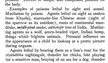 Examples of poisons lethal by sight and sound. Mutilation by poison. Agents lethal on sight as snakes from Khazluj, marcasite-like Chinese stone (sight of the sparrow as its antidote), roots of continental mandrake, midhyiind snake, saliisaqIr tree of India. Mutilating agents as a wolf, acorn-headed viper, Indian hemp, things which frighten animals. Prenatal influence on the appearance of a child by looking at a pretty picture during orgasm. ---- The Book of Poisons by Ibn Wahshtya ; Transactions American Philosophical Society 1966 Vol.56 No. 7: pg11