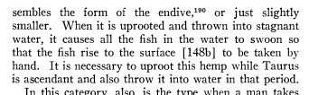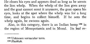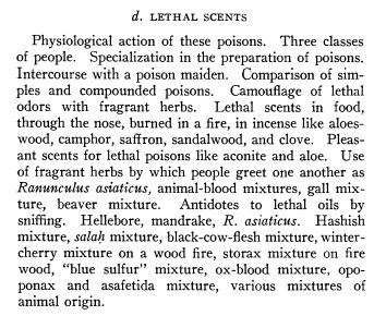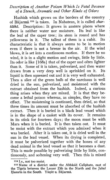 Also, in this category, there is an Indian hemp in the region of Mesopotamia and in Mosul. Its leaf resembles the form of the endive, or just slightly smaller. When it is uprooted and thrown into stagnant water, it causes all the fish in the water, it causes so that the fish rise to the surface to be taken by hand. It is necessary to uproot this hemp while Taurus is ascendant and also throw it into water in that period. ---- The Book of Poisons by Ibn Wahshtya ; Transactions American Philosophical Society 1966 Vol.56 No. 7: pg 27-28 On the Treatment for Drinking Blood of the Bull, Fresh or Not If a man drinks one Mithqal of this blood at the time of the slaughtering of the bull, then he will die in from six to eight hours. . . . His treatment is that he be made to vomit sufficiently using oxymel, macerated cut-up radish, and boiled juice of dill which had been crushed between the hands. After he vomits by repeating the oxymel [medicine] and the drinking of water so that nothing remains in his stomach, he must eat figs macerated in ivine into which finely pulverized natron has been thrown. When the figs reach his stomach, have him drink exactly one half ratl of simple oxymel which is made up of vinegar and sugar only. Make him drink one-half rail of rainwater. Hurry. Take three mitlzqdls each of hemp seed and root of asafetida, or take instead seed of the black cumin, mustard, and pepper in the same quantities and pulverize them finely. . . . . ---- The Book of Poisons by Ibn Wahshtya ; Transactions American Philosophical Society 1966 Vol.56 No. 7: pg 80 d. LETHAL SCENTS “Antidotes to lethal oils by sniffing. Hellebore, mandrake, R. asiaticus. Hashish mixture, salah mixture, black-cow-flesh mixture, winter-cherry mixture on a wood fire, storax mixture on fire wood, "blue sulfur" mixture, ox-blood mixture, opoponax and asafetida mixture, various mixtures of animal origin.” --- The Book of Poisons by Ibn Wahshtya ; Transactions American Philosophical Society 1966 Vol.56 No. 7: pg 11