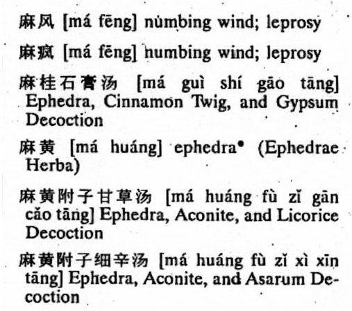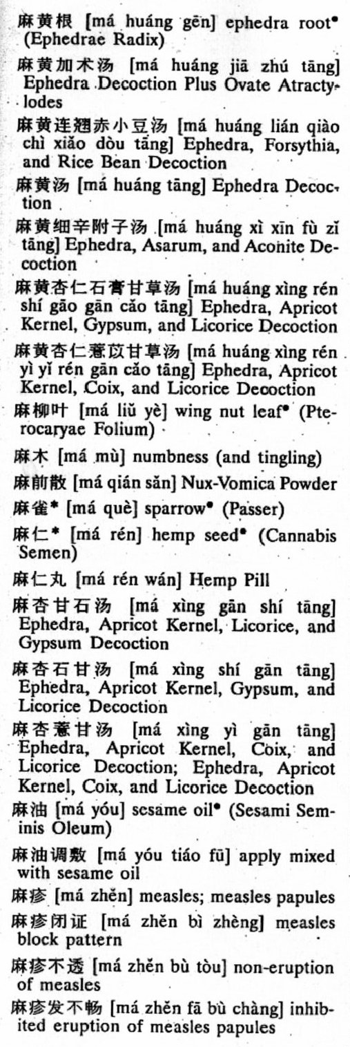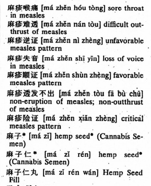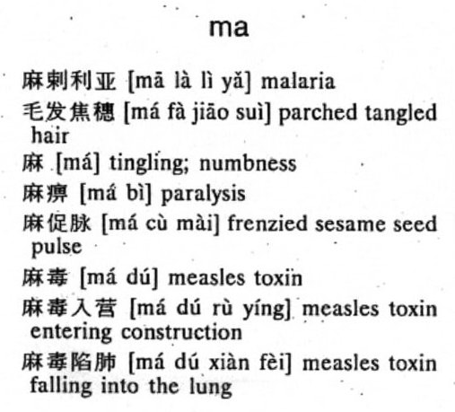 Examples: #1 The Chinese word/concept for POLIO is: Examples: #2 The Chinese term for ‘General Anesthetize’ is: 2- Next Just like in English, we have the problem of multiple words, which (in essence) means the same thing. For example according to an official handout [State of Indiana - Board of Health 1938] MARIJUANA OR MARIHUANAAnd to the above must be added, mariguana, maria-huna, etc. Point being made; that we have a lot of names for what is essentially the same plant. Thus it should come as no surprised that the Chinese language also used a variety of names, such as: